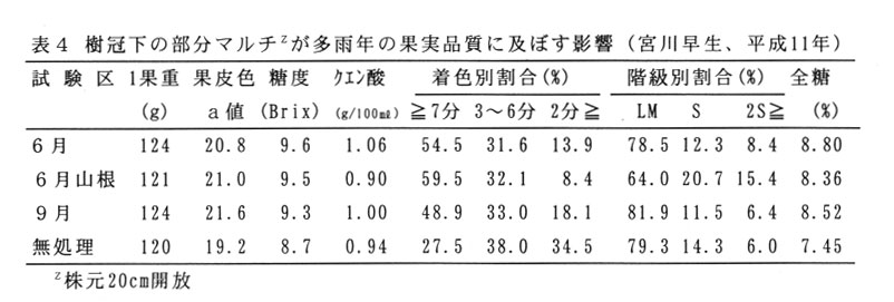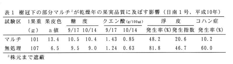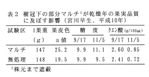干ばつ傾向の年(平成10年)には、日南1号、宮川早生ともに9月中旬の糖度は10%前後まで高まるものの、大量の秋雨後には糖度上昇は止まり、収穫時にはむしろ低下するが、通気性多孔質シートを樹冠下に8月下旬から根域の約80%をマルチすると、両品種とも糖度が1度以上高くなる。また果皮色が濃くなり、日南1号では浮皮の発生が軽減され、果皮障害の発生も少なくなる(