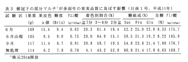株元を約20cm開けた部分マルチ(被覆率約80%)においても、夏・秋季多雨年(平成11年)において日南1号の糖度は6月被覆で1度以上、9月被覆で約1度高くなる。山根側の片面マルチでも1度以上高くなる(