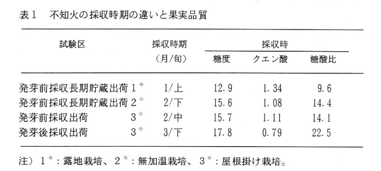 1月上旬採収の露地栽培の果実糖度は13以下で低く、クエン酸は1.3%以上と高く、食味は劣る。その後、低温貯蔵して4月下旬に出荷してもクエン酸は1.0%以上で、しかも果実間でばらつきが多い。2月採収の施設栽培の果実糖度は15以上で、クエン酸は1.1%程度であるが、採収後低温貯蔵してもクエン酸の減少は少なく、じょうのうは硬く、肉質も不良で食味が劣る。一方、発芽2週間後まで着果させ採収した果実は、糖度が18近くに達する。クエン酸は発芽後急速に減少し、糖酸比が高い。なお、す上がりが僅かに認められるが、食味は著しく良い(