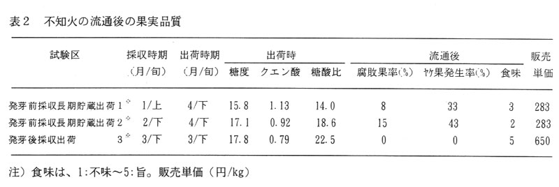 不知火の栽培面積も1,000haを越えたが、食味のばらつきが多く、貯蔵出荷流通後の品質の劣化あるいは樹勢低下し易いなど問題点が多い。一般に露地栽培の不知火は1~2月に採収され、2カ月以上貯蔵されて出荷されるが、減酸には果実や園地間で差があり、酸高果が多く食味評価を落としている。しかも貯蔵庫内や出庫後市場において果皮障害が多発し、腐敗も多い。また、無加温栽培や屋根掛け栽培においては、早期に出荷すると果皮障害は発生しないが、糖度が低く露地栽培よりも食味が劣る場合が多い。そこで、クエン酸含量の高い日向夏や河内晩柑では、発芽後採収して食味を向上させているが、同様に不知火において発芽後採収の食味向上や鮮度保持効果に及ぼす影響を検討する。