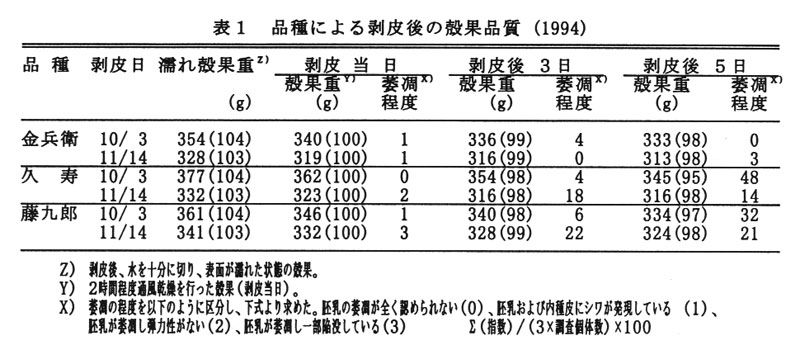 外種皮の剥皮、乾燥後の胚乳の萎凋は、「久寿」・「藤九郎」が「金兵衛」に比べ進みやすい。また、収穫の早い未熟な種子が萎凋しやすい(
