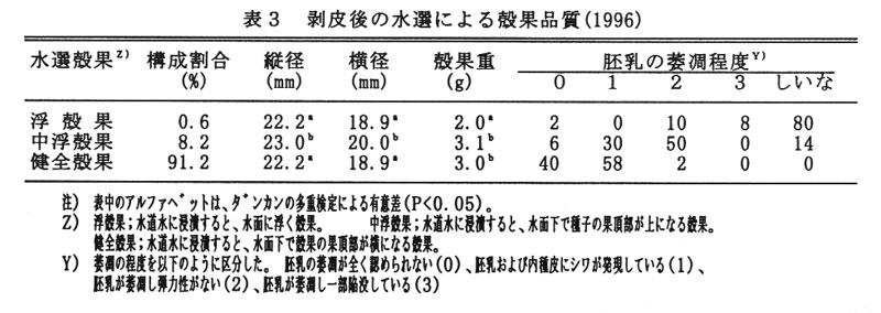 水選では、胚乳および内種皮にシワが出来る程度に品質低下した殻果は、選別できない。