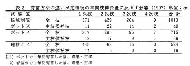 そこで、計画的に改植を進め、早期成園化につながるポリエチレン製ポットを利用した大苗育苗技術について検討する。