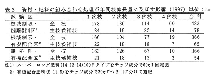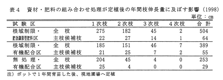 施肥量は1ポット当たりチッソ成分で年間60g程度とする。肥効調節型肥料を使用すると年1回植え付け時の施肥でよく、作業の省力化が図られる。また、根域制限資材と肥効調節型肥料を併せて使用すると、生育が著しく良好となる(