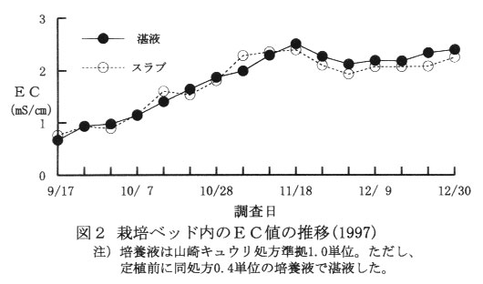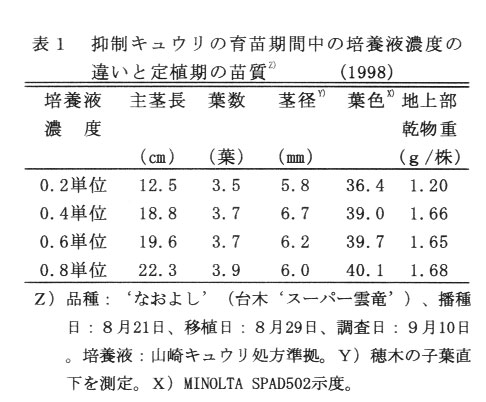 では、‘なおよし’を使用し、育苗期には山崎キュウリ処方準拠の0.4単位、本圃では1.0単位の培養液を用いて