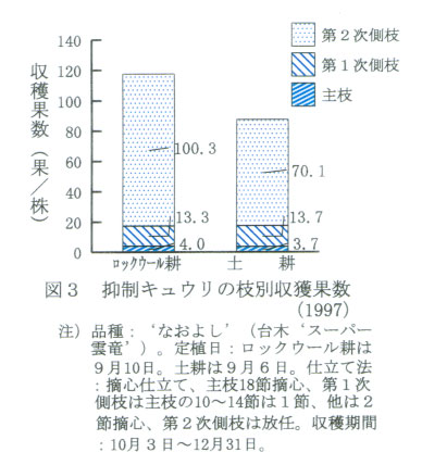 特徴:土耕栽培に比べて第2次側枝の着果が多く、著しく増収する(