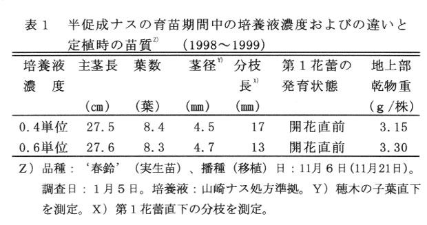 では、‘春鈴’の実生苗を使用し、育苗期には山崎ナス処方準拠の0.4単位、本圃では1.0単位の培養液を用いることで、育苗の