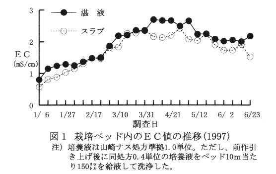 前作に抑制キュウリを栽培した場合、前作引き上げ後には、0.4単位の培養液を株当たり8リットル給液してEC値を低下させておく。また、湛液中のEC値が3.0mS/㎝以上となった場合にも同様の方法で洗浄する。