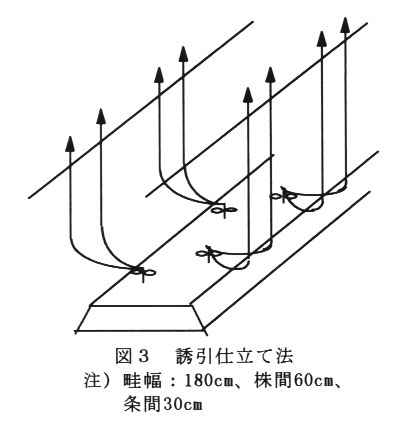 栽植様式:うね幅180cm、株間60cm、条間30cm、2条千鳥植えとする(1,850株/10a、誘引枝 3,700本/10a)(