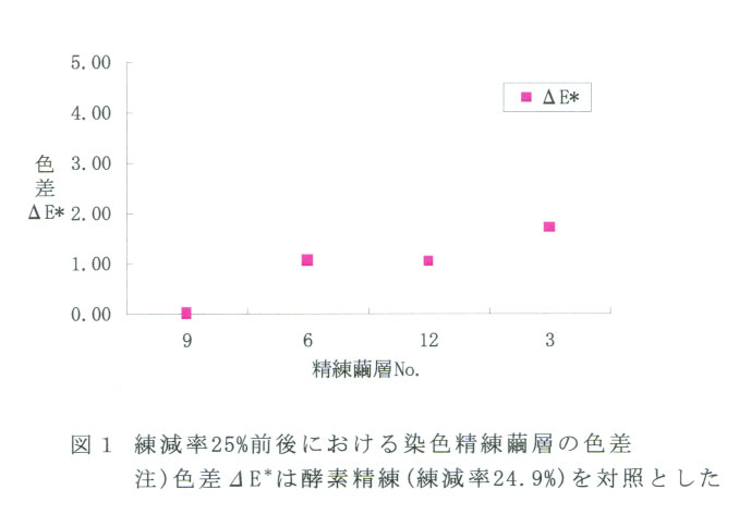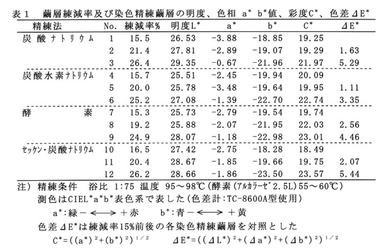 染色した精練繭層は、いずれの精練法でも練減率25%前後で明度は高く、緑味は減少し、青味は増加し、鮮やかさが増す。(
