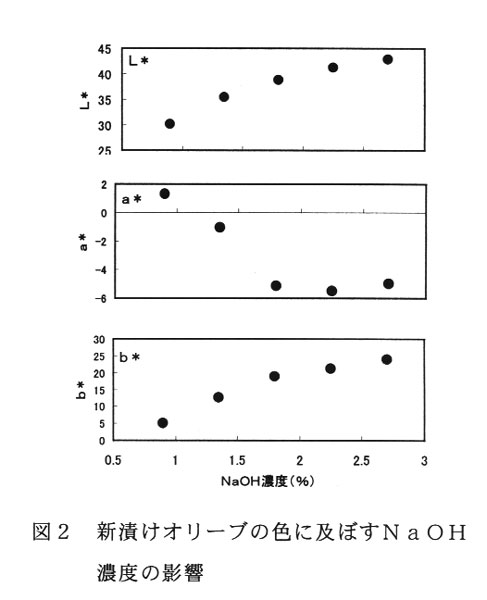 の製造条件に関しては、果実を処理するNaOH溶液及びNaCl溶液の濃度、ならびに製品の加熱殺菌処理条件はその品質に対してそれぞれ影響を及ぼす。