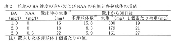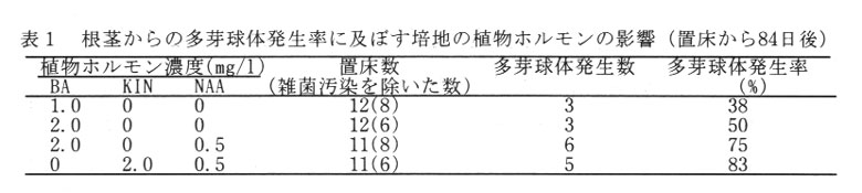 若い根茎の先端部を殺菌し,2.0mg/lのBAまたはKlNと0.5mg/lのNAAを含むMS培地で培養すると,1カ月から2カ月後に多芽球体が発生する(