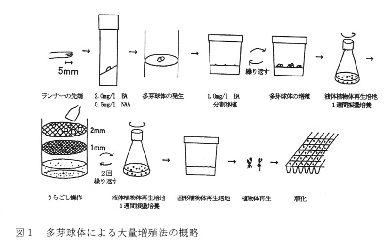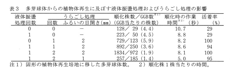 多芽球体を分割し1/2濃度の液体MS培地で1週間振盪後,目開き2mmのメッシュでうらごし操作した直径1mm以上の多芽球体を1週間振盪培養する処理(うらごし処理)を2回繰り返し,1/2濃度のMS固形培地に播くことにより,効率的に植物体が再生し,順化時の労刀が少なくなり,活着率が向上する。(