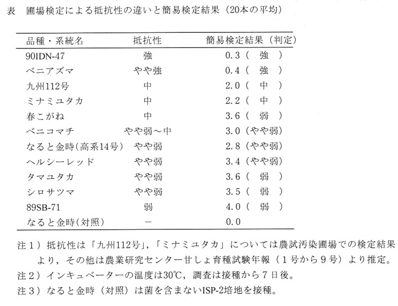 茎の細い品種は,腐敗や黒変を起こしやすく,検定結果と抵抗性が異なる場合がある(「春こがね」等)。
