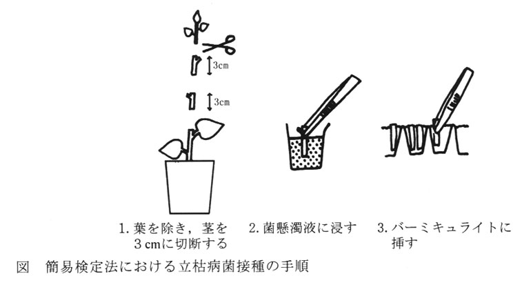 温室で育成した植物の茎を,茎頂から約5cmより下で長さ約3cmに4本切り取り,菌懸濁液に上側の切り口以外の部分を数秒間浸した後,128穴セルトレイに入れたバーミキュライトに1穴につき2本ずつ揮す。インキュベーター内で乾燥しないように約30℃に保ち,5日から7日後に病徴を調査する(