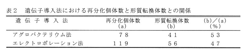 アグロバクテリウム法(カルス誘導期間28日、前培養期間12日)とエレクトロポレーション法との再分化個体に対する形質転換割合を比較した結果、アグロバクテリウム法の方が約6%高い(