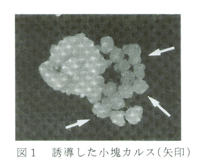 松山三井の再分化能力の高いカルス(小塊)は、N6墓本培地にカザミノ酸(300mg/リットル)、プロリン(2878mg/リットル)、2,4D(2mg/リットル)、ショ糖(30g/リットル)を加え、支持体にゲルライト(4g/リットル)を用い、前培養(継代:同培地)を行うことで誘導できる(