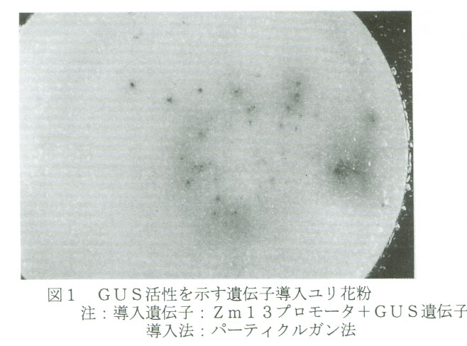 )。GUS遺伝子のユリ花粉での発現には35sプロモータ系に比ベ、トウモロコシ由来の花粉特異的なZm13プロモータが優れている。