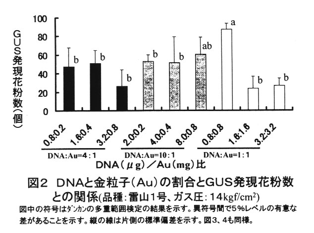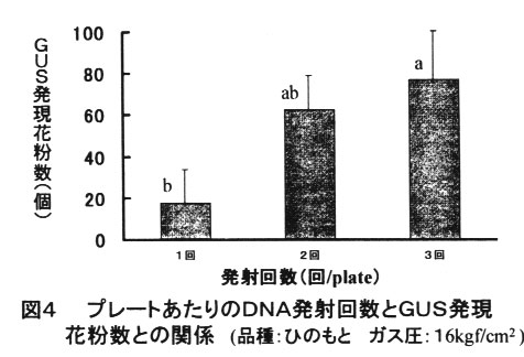 パーティクルガンの成熟花粉への遺伝子導入条件は、1回の発射あたりのDNAと金粒子量が各々0.8μgと0.8mg、花粉密度が2×10