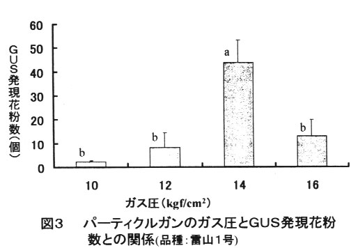 及び内部圧力が60mmHgが良く、上記の条件で最大0.4%の花粉でGUS遺伝子が発現する(