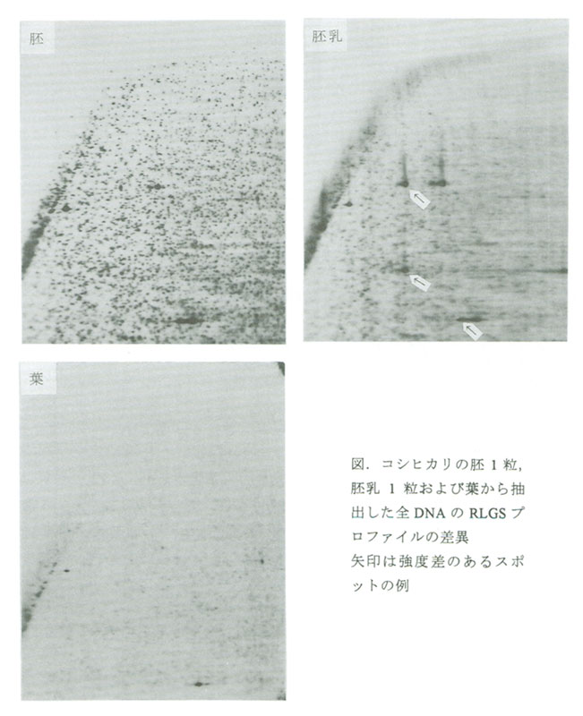 玄米の胚1粒,胚乳1粒および葉のそれぞれから抽出した全DNAを用い,メチル化感受性の制限酵素であるNotIの認識サイトをランドマークとするRLGSの2次元スポットプロファイルを得て互いに比較することにより,高コピーDNA領域に対応する幾つかの特定のスポットに強度差が認められる(