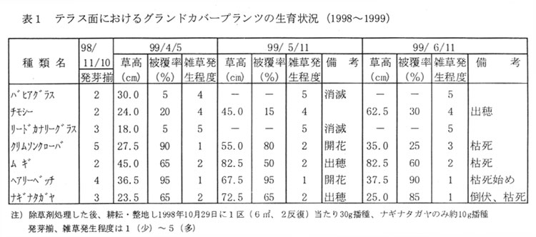 テラス面においては、ヘアリーベッチの生育が旺盛で春雑草の抑草効果が高い。また、6月中旬頃より順次枯死してマルチ状になり、夏雑草の発生を抑制する(