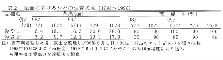 植栽した法面は高さ1~2m、傾斜角度45度、傾斜方向南向きの場内ほ場である。