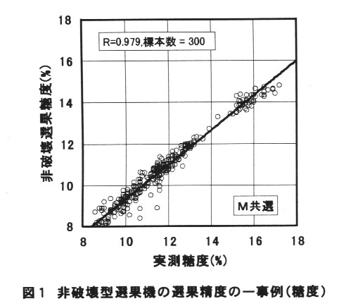 )。同じ果実を繰り返し選果した場合の読みとり誤差は、糖度で0.2~0.6度、酸度で0.05~0.09%である。