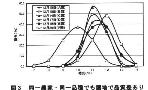 は高いが酸度については若干の問題がある。産地活性化のため、非破壊型選果機の特性を十分把握し、ばらつきの少ない果実販売と適正な栽培指導が必要である。
