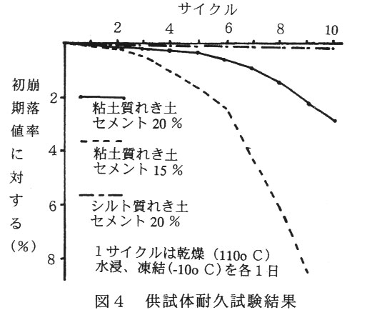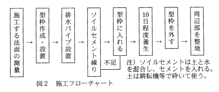 に示す。ソイルセメントは、現地土とポルトランドセメント(以後セメントという)、水を混合して作る。この場合、セメントは20%程度、水は現地土の水分状態によって決めるが30~80%程度とする。型枠は、施工後10日程度で外す。