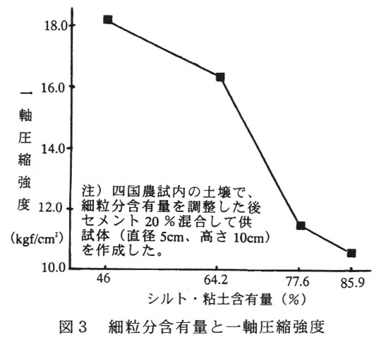 ソイルセメントの強度は、細粒分の量によって変化するが、セメントを20%混合すると一軸圧縮強度で10kgf/cm2 以上の強度が得られ(