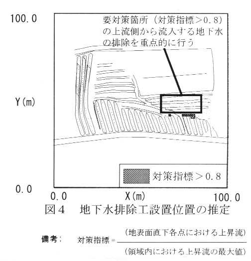 地下水流動の予測結果をもとにして,地下水の上昇流の発生箇所から地下水排除工を重点的に施工する箇所を推定できる(