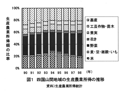 四国山間地域の農業生産は米,野菜,畜産が主であり,近年では野菜・花きの生産額 比率が伸びている(