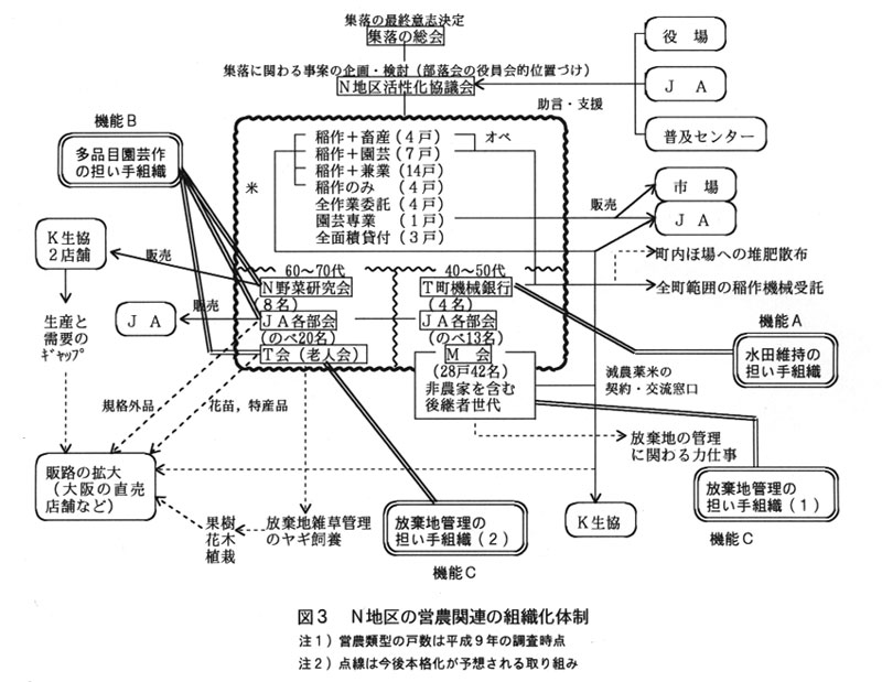 2)軽量園芸作目の多品目少量生産がJA部会,N野菜研究会,老人会などで取り組まれている(機能B)。規格農産物の市場出荷とともに規格外農産物も市場外流通を図るなど販売ルートの複線化を図ることで高齢者・女性の営農意欲に結びついている。