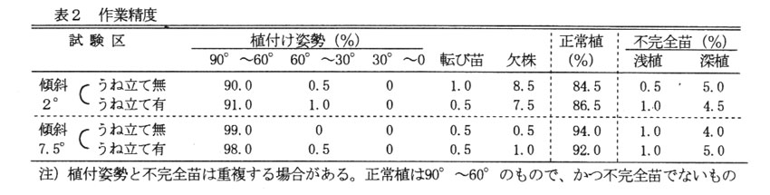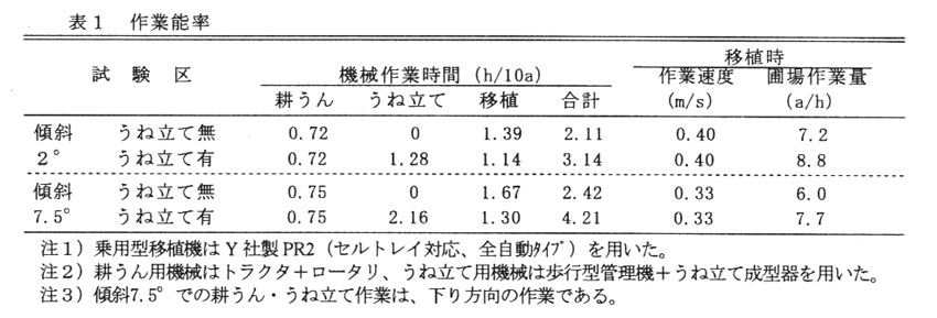 機械移植時の作業能率は6.0~7.2a/hと、うね立て作業を行った場合よりも20%程度低くなるが、移植精度はうね立て作業を省略しても同程度である(