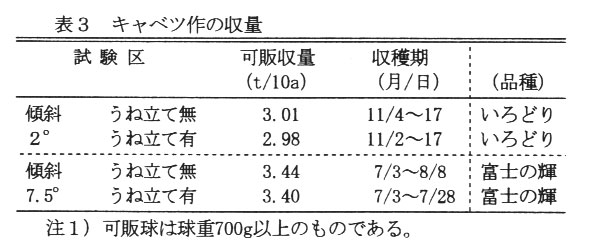 緩傾斜畑においては、うね立て作業を省略しても、キャベツ作では同等の収量が得られる(