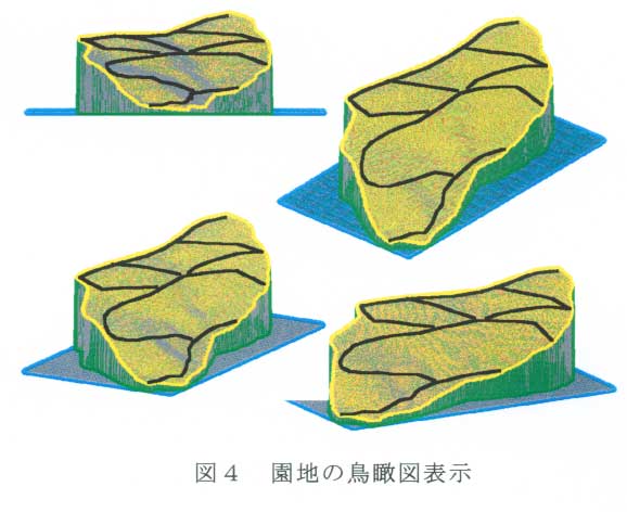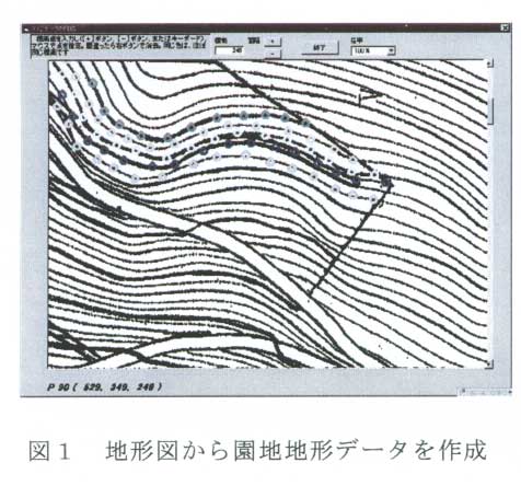 園地の地形データは1/2500等高線地図から作成できる。対象園地を含む地図をスキャナで読み込み、画面上の等高線を順次マウスでクリックすることにより、園地の3次元地形データが作成される(