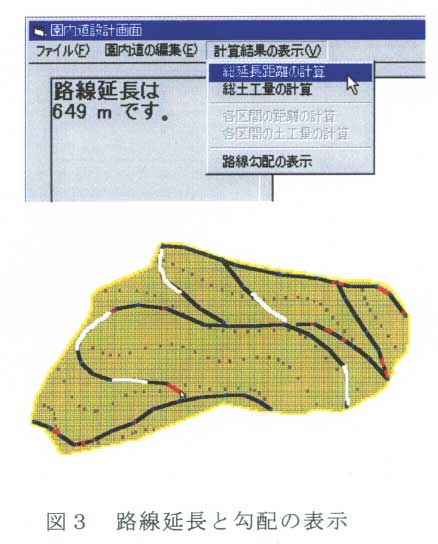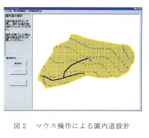 園内道の経路設計は園主の希望や改植の計画などに基づき、システムの使用者自らが行う。希望するルートを順次クリックすると園地に道が書き込まれていくので、紙の上に鉛筆で線を引くような感覚で路線設計ができる(