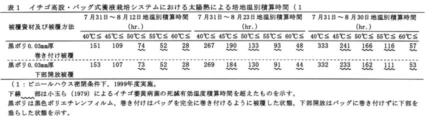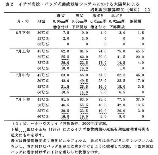 イチゴ高設・バッグ式養液栽培システムにおけるバッグ内培地を夏期高温時にハウス被覆下で,かつ,バッグをフィルムで被覆することで,病原菌の中では耐熱性の高いイチゴ萎黄病菌の消毒に有効な培地温積算時間(小玉ら,1979)が確保できる(
