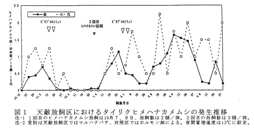 本試験では、天敵としてタイリクヒメハナカメムシを10月上旬(2頭/株)、12月末(3頭/株)に放飼、マメハモグリバエの導入寄生蜂を11月中旬に1ボトル/2a、2回処理し、受粉にはマルハナバチを利用した。夜間の最低温度は13℃に設定した。
