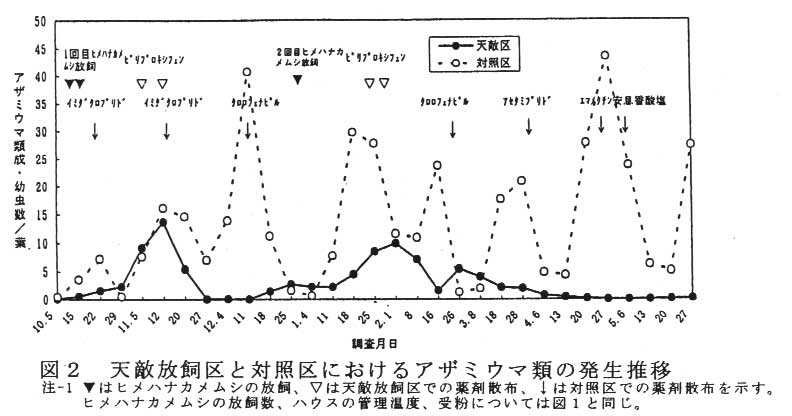 アブラムシ類の発生は1.に示した防除対策で2月頃まで発生を抑えることができるが、3月以降有翅虫が頻繁に侵入し始める。しかし、殺虫剤の使用回数が少ない本防除体系下では土着天敵が活発に働くため、高密度になることは少ない。