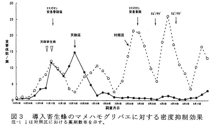 マメハモグリバエの発生初期に導入寄生蜂(イサエアヒメコバチ、ハモグリコマユバチ)を1週間間隔で2回放飼すれば、その後栽培終期まで薬剤に頼ることなくマメハモグリバエの発生を少なく抑えることができる(
