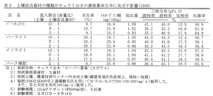 リン酸施肥量が同等の場合、共生率は原土に混入する土壌改良資材の種類によって異なり、バーク堆肥やバーミキュライトよりもパーライトやイソライトを使用することにより共生率が高まった。また、土壌改良資材の混入割合が10:1~2:1の範囲では物理性の変化は認められるものの、共生率に差は認められない(