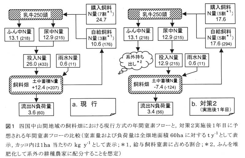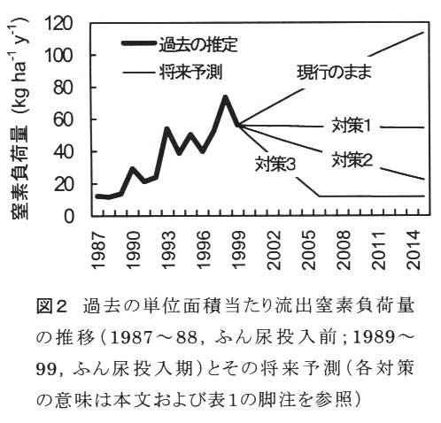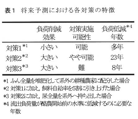 乳牛飼育により生じたふん尿を,生に近い状態で飼料畑に全量投入する現行の方式では,過去10年間にわたる窒素投入が土中窒素の過剰蓄積をもたらしており,将来も流出窒素負荷量が増加し続けると予測される(