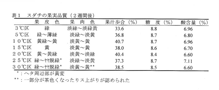 スダチは緑色であることが必要であるが、どのような環境条件が緑色保持に悪影響を及ぼすかを明らかにする。また、年内向け果実の貯 蔵は長期貯蔵(3月上旬)ほどの手間をかけたくない。そこで、短期貯蔵の省力化を図りしかも高品質な貯蔵技術について検討する。