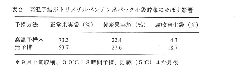 高温予処(30℃、18時間)し、トリメチルペンテン系パックで貯蔵(5℃)することにより、果実の緑色保持効果」が高くなる。また、障害果の発生も少なくなる。(