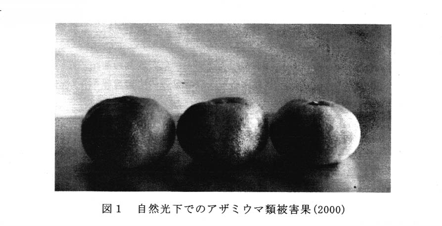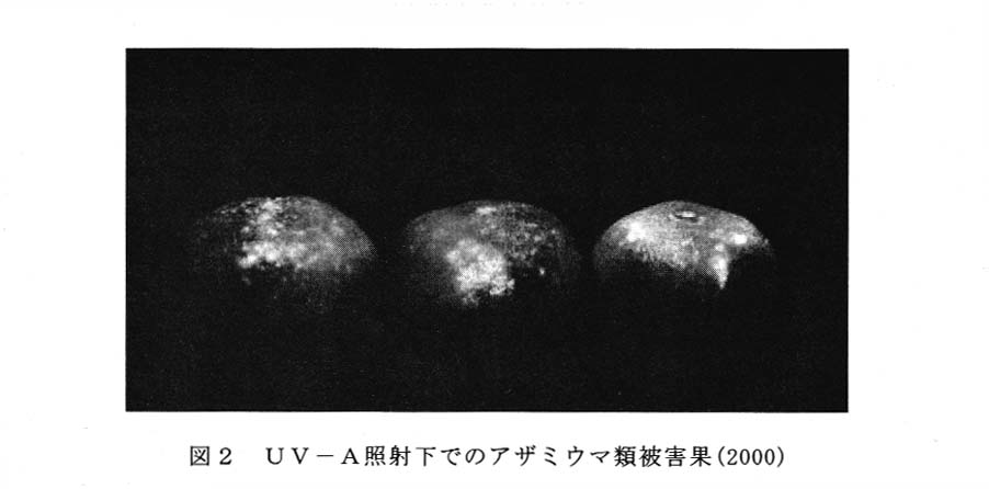 ハウスミカン果実に,暗黒下で,近紫外線(UV-A:ピーク波長 365nm)を照射すると,アザミウマ類の被害痕は蛍光を発するため,肉眼での判別が容易となる(