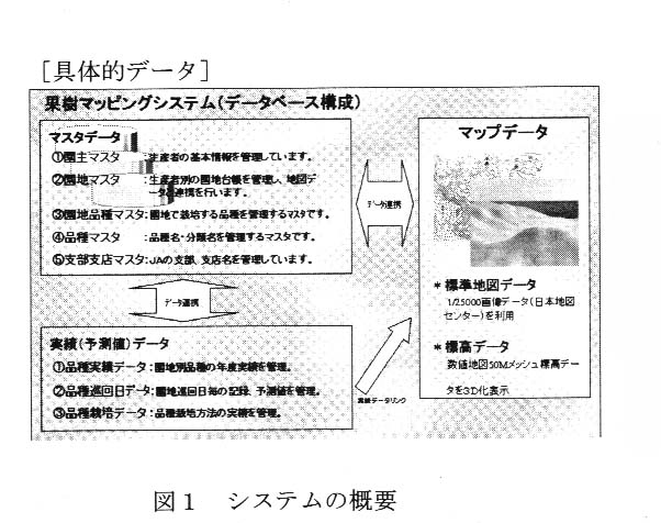 システムは,地図情報を収納したマップデータ,園地情報を収納したマスタデータ及び選果データ等を収納した実績データの3つのデータベースにより構成される(