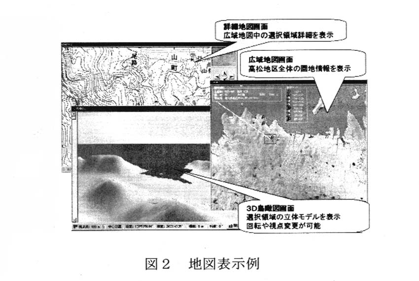 マップデータは,市販の1/25,000画像データを用い,広域図,詳細図のほか,数値地図(50mメッシュ)を利用した3D鳥瞰図により,大まかな園地の位置と形状が表示できるため,システムの対象地域のデジタルマップを新たに作成する必要はない(