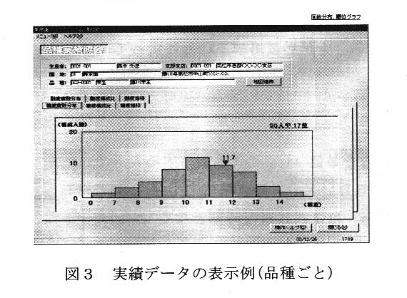実績データは,園地別の果実品質,収量及び販売単価の実績と巡回日ごとの果実品質及び収量等の予測を登録し,個人あるいは園地ごとの品質の分布や推移等を瞬時に表示できる(